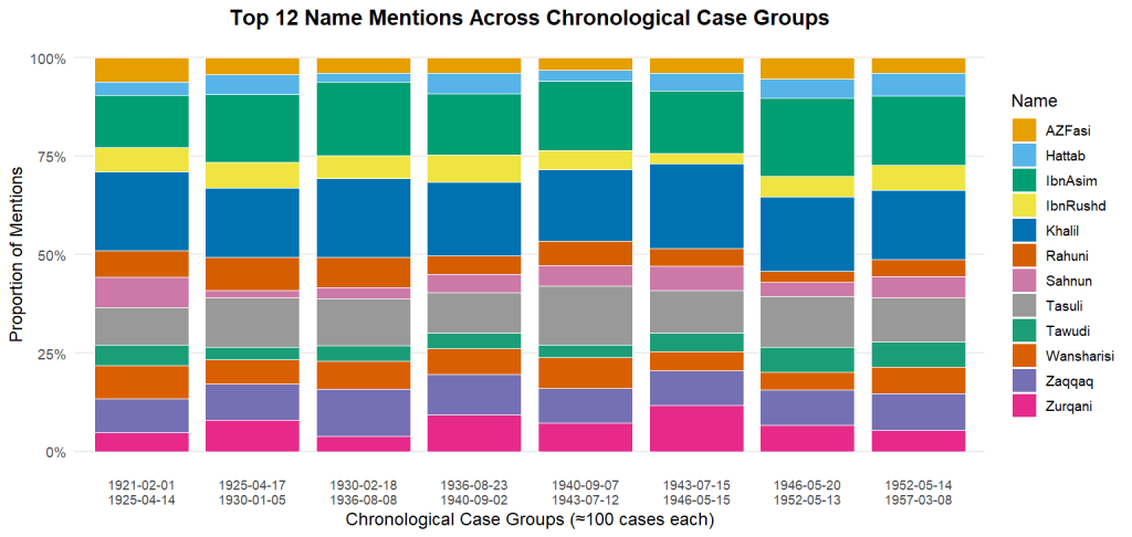 لا توجد إشارة إلى أن أي فقيه بعينه أصبح أكثر أو أقل بروزًا كنسبة من إجمالي الذكر مع مرور الوقت (رغم أن إجمالي ذكر الفقهاء كان يعلو ويدنو في مجموعة البيانات).